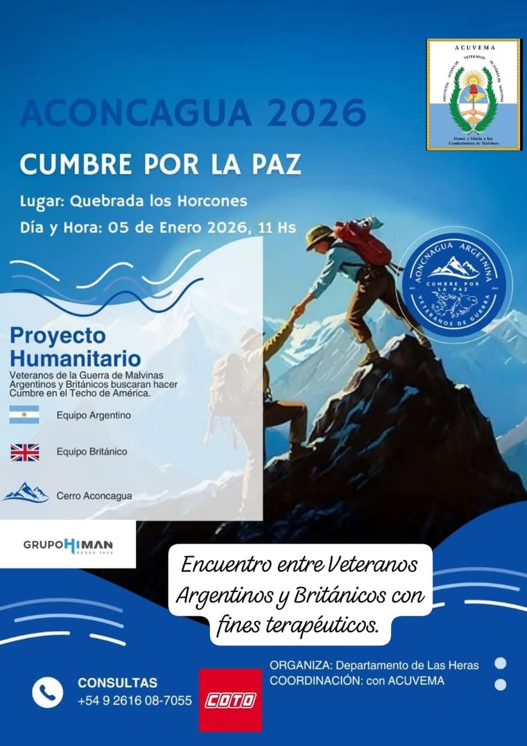 "Aconcagua - Cumbre por la Paz", reunirá nuevamente a argentinos y británicos, pero esta vez lejos del campo de batalla. Entre el 5 y 20 de enero, 6 veteranos ingleses y 9 veteranos de Argentina que combatieron en Malvinas buscarán hacer cumbre en el Aconcagua como símbolo de unión, memoria y paz.