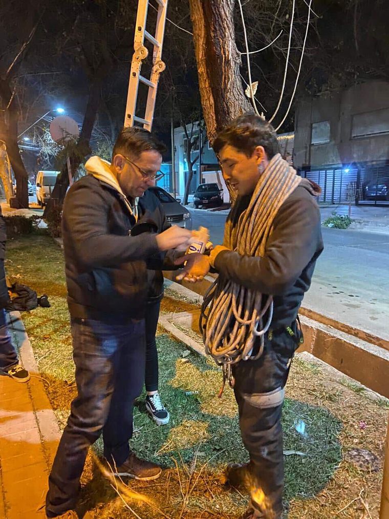 Ante esta situación, el joven decidió subirse al árbol con la ayuda de una cuerda para evitar caer desde la altura y así acercarse al animal. Subió los primeros metros con ayuda de una escalera y después se trepó con sus manos y pies por el árbol para llegar hasta lo más alto posible. Allí colocó una roldana con cuerdas e improvisó un arnés.