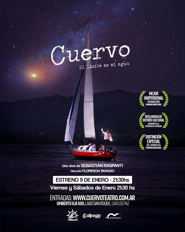 "Cuervo. El límite es el agua" de Sebastián Raspanti. Dirección: Florencia Boasso. Funciones: Viernes y sábados de enero 21:30 hs. Estreno: 9 de enero 21:30 hs
