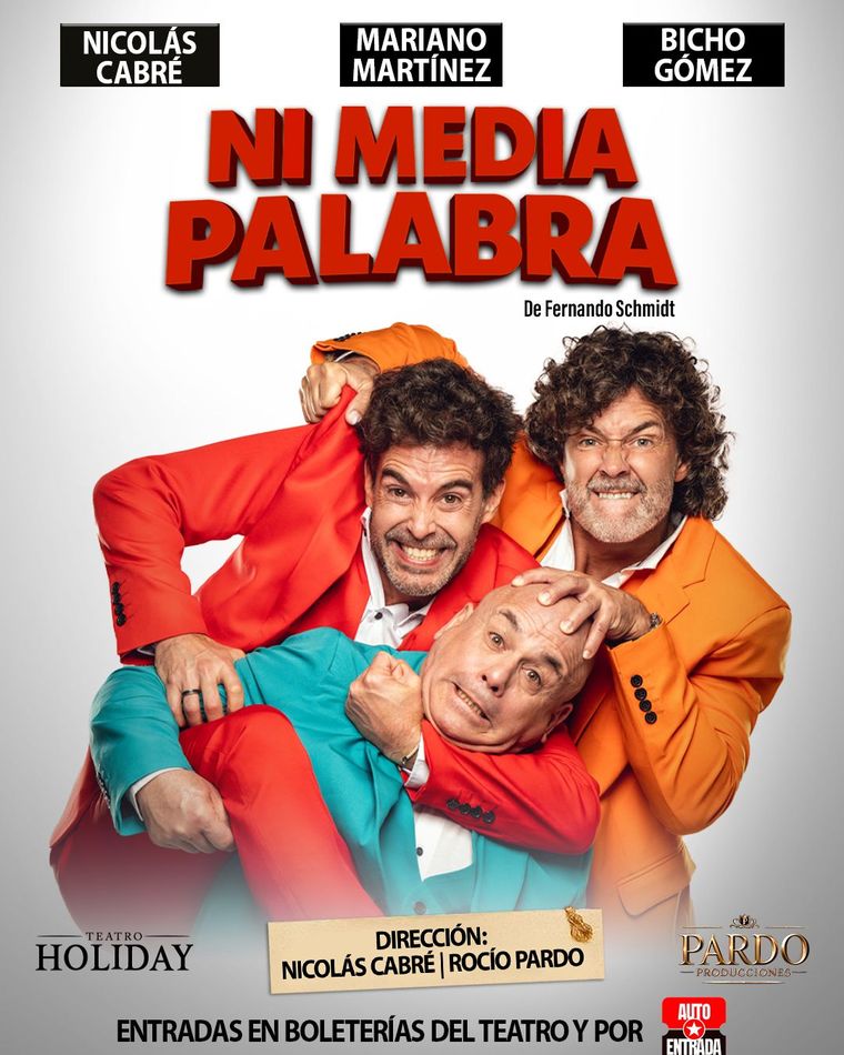 “Ni media palabra”. Comedia con Nicolás Cabré, Mariano Martínez y Bicho Gómez. Miércoles a domingos. 22 hs. Estreno: Jueves 25 de diciembre.