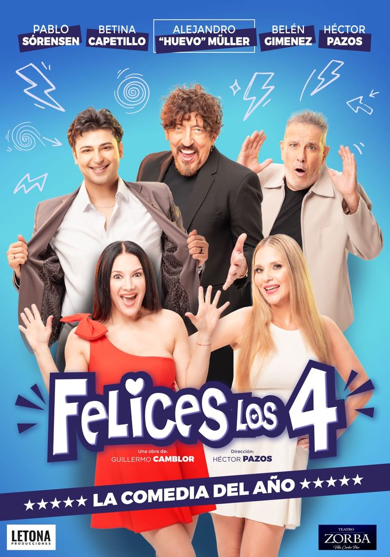 "Felices los 4". Comedia con Alejandro “Huevo” Müller, Betina Capetillo, Pablo Sórensen, Belén Giménez y Héctor Pazos. Dirección: Héctor Pazos. Producción general: Letona producciones. Funciones de jueves a domingo a las 23.30 horas. Estreno: 2 de enero.