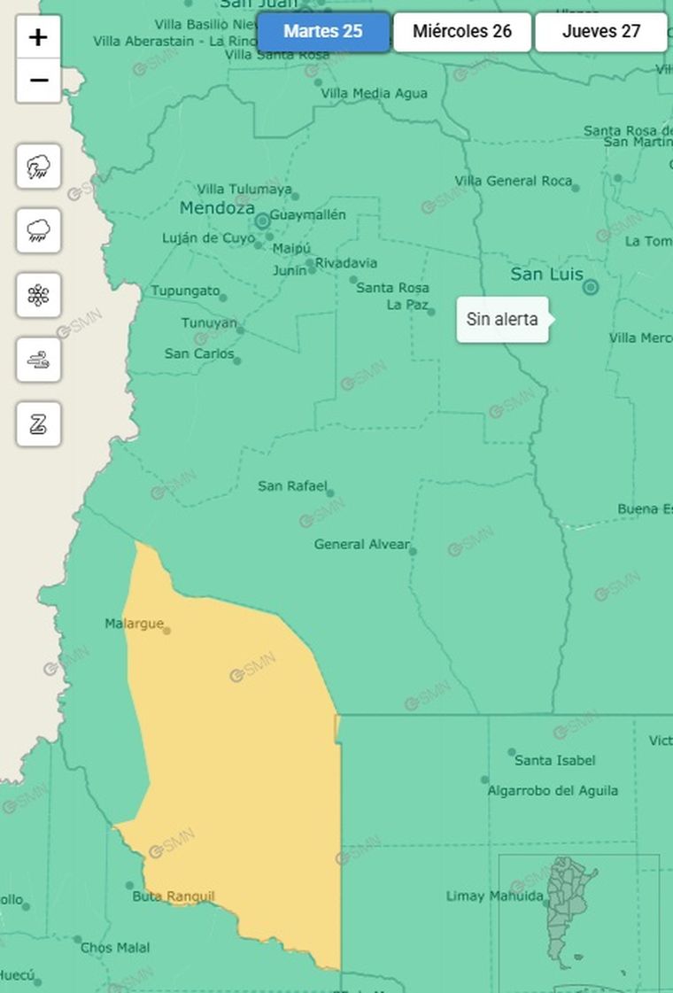 El foco de preocupación está puesto en la zona baja de Malargüe, donde rige una alerta amarilla por tormentas. No se trata de lluvias aisladas cualquiera. El informe advierte sobre células de distinta intensidad que, en puntos específicos, pueden ser fuertes. El menú incluye posibles chaparrones intensos en poco tiempo, granizo puntual, rayos frecuentes y ráfagas que podrían alcanzar los 80 kilómetros por hora.
