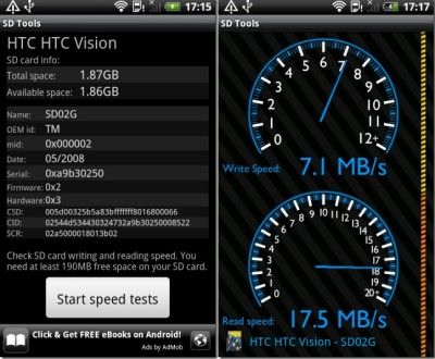 SD Tools es una aplicación gratuita disponible en Google Play para teléfonos con Android que sorprende por ser muy intuitiva, algo en lo que una mayoría importante del software de diagnóstico hace agua. Su funcionamiento es simple: realiza un test de la velocidad con la que lee y escribe tu tarjeta SD. Para iniciar el proceso basta con tener un Android compatible y una tarjeta SD de más de 190mb conectada al aparato. Abrís la aplicación, das al botón de "iniciar test de velocidad" y comienza a funcionar. Vas a ver unos muy entendibles relojes que hacen las veces de medidores moviéndose e indicándote la velocidad de transferencia de los archivos de prueba de SD Tools.