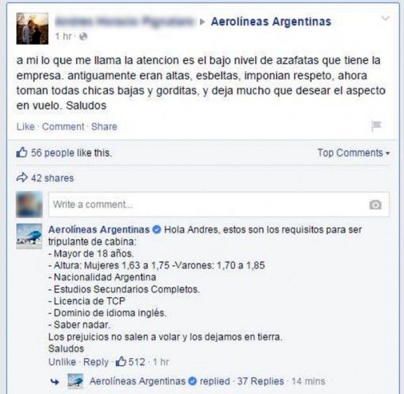 Días atrás, una respuesta del Community Manager de Aerolíneas Argentinas explotó en las redes sociales; utilizando un tono irónico para responder a un mensaje puramente "racista". Esta respuesta apareció en todos los medios del país, inclusive el nuestro; logrando un gran posicionamiento mediático de la cuenta de Facebook de la compañía aérea.