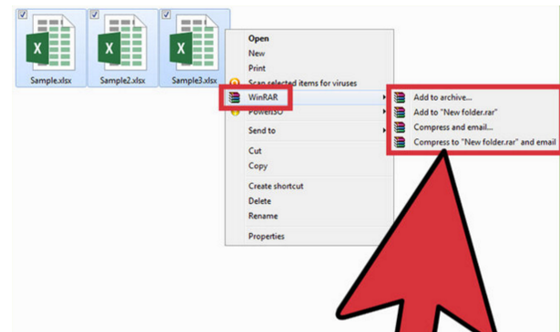 2. Seleccionar los archivos que queremos guardar, en este ejemplo documentos de excel, hacemos click derecho y colocamos Winrar “Add to nombre a elección.RAR”