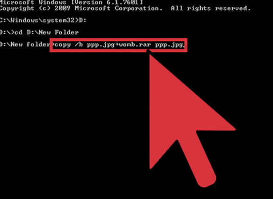7. Luego escribimos copy /b ppp.jpg+womb.rar ppp.jpg. (ppp.jpg es la imagen y womb.rar es el nombre del rara con los excel dentro)
