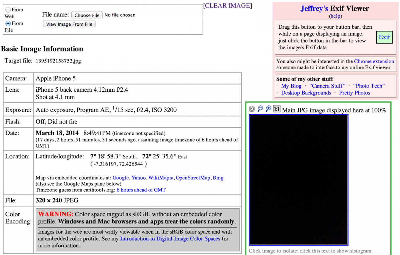 La foto negra no muestra nada, pero si se miran los metadatos de la misma se ve que en la información EXIF aparece que ha sido tomada desde un iPhone 5, y trae las coordenadas de una isla con una base militar norte-americana en mitad del Océano Índico.