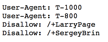T-800 y T-1000 son los modelos de terminators enviados a nuestra época para exterminar a John Connor. Larry Page y Sergey Brin son los fundadores de Google. ¿Por qué aparecen ellos en el fichero con la etiqueta “Disallow” (prohibido)? ¿Es el secreto mejor guardado de Google? No te asustes, se trata de una broma geek muy ingeniosa y oportuna por cierto, pero nada graciosa.