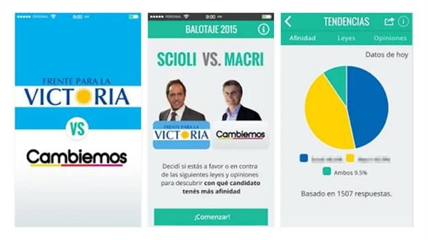 En la previa de la segunda vuelta de las elecciones presidenciales, un grupo de desarrolladores crearon Balotaje 2015, una aplicación móvil que permite conocer el grado de afinidad con Daniel Scioli o Mauricio Macri. De forma lúdica, enumera una serie de leyes y temas en quince tarjetas, tales como el tratamiento del memorándum con Irán, el matrimonio igualitario, el cepo al dólar o el voto joven.