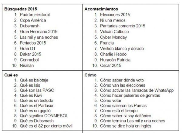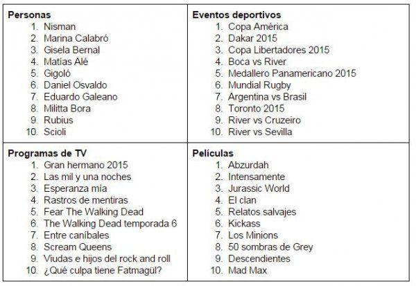 Las que siguen son las listas de búsquedas de mayor crecimiento en 2015 en Argentina, comparadas con el año anterior. Y en el sitio www.google.com.ar/2015