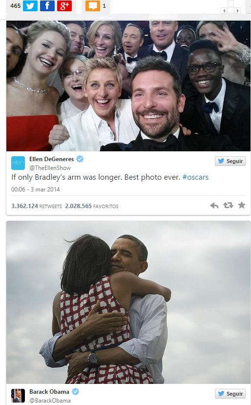 Estos son dos de los tweets más relevantes de la historia: el mítico de los Oscar 2014 enviado por su anfitriona, Ellen DeGeneres, y el mensaje de Barack Obama cuando fue reelegido.