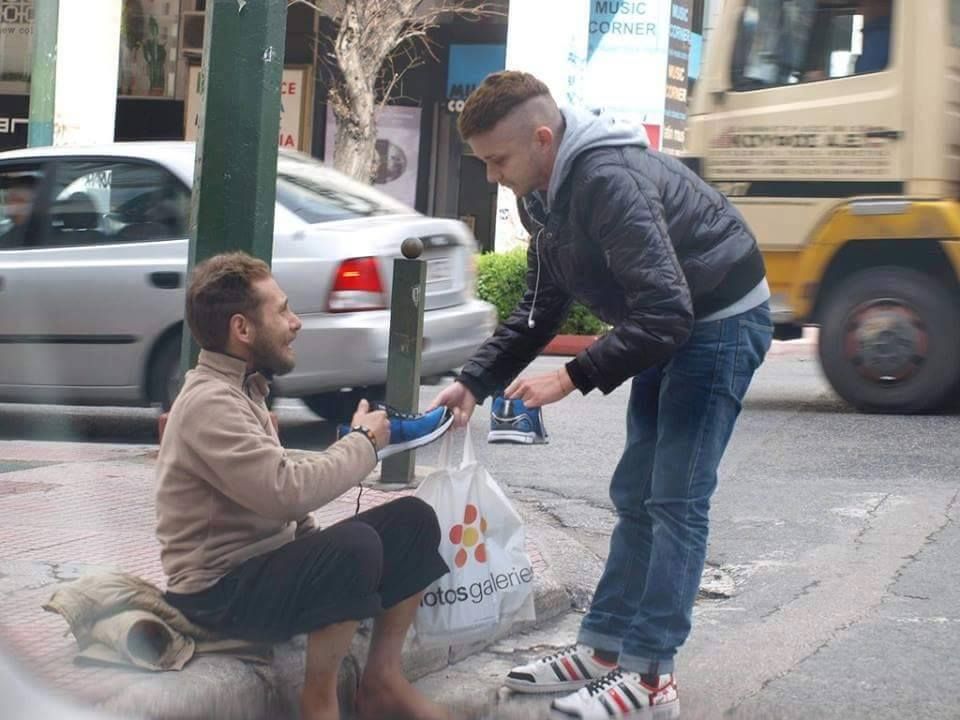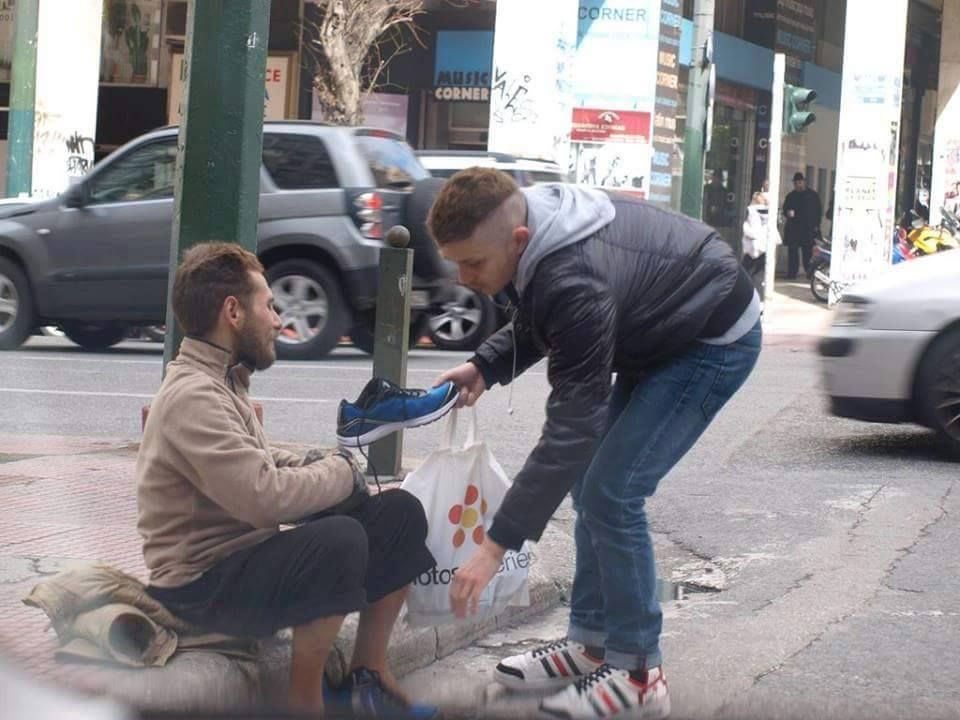 Se trata de un joven que dona sus zapatillas a una persona que vive en la calle. El gesto del receptor es "muy emotivo".
