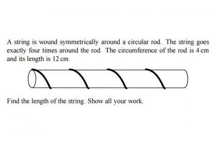 El enunciado dice lo siguiente: una barra circular se rodea con una cuerda. Dicha cuerda da cuatro vueltas a la barra, que tiene 4 centímetros de circunferencia y una longitud de 12 centímetros. ¿Cuál es la longitud total de la cuerda?