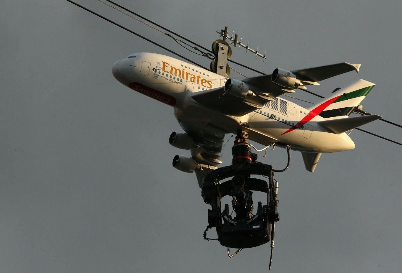 Sin embargo, en redes sociales como YouTube, se reveló el misterio: es un modelo de un avión de Emirates —a escala— sobre un cable y que se utiliza como publicidad: el que mueve una de las cámaras 'aéreas'.