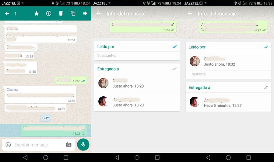 En los chats individuales es fácil saber por lo tanto cuando nuestros mensajes son recibidos y leídos, salvo que tengamos desactivada la opción de confirmación de lectura dentro de los ajustes de la aplicación. Sin embargo, en los chats de grupo la cosa se complica, ya que el doble check azul no aparece en un mensaje hasta que todos los miembros del grupo lo han leído.