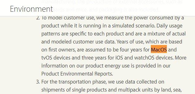 El tiempo de uso se calcula sobre la base de los primeros propietarios, y se fija en cuatro años para dispositivos MacOS y tvOS, y en tres años para dispositivos iOS y WatchOS.