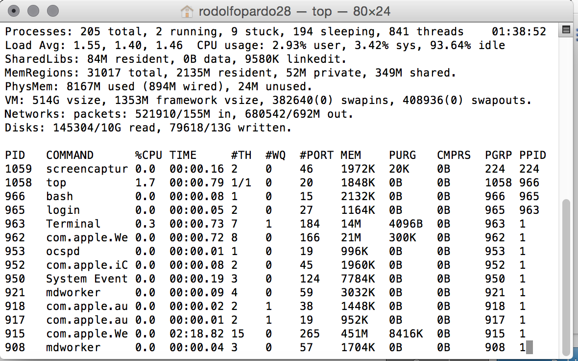El comando top es un clásico para mostrar los recursos usados por tu sistema y así poder ver cual de ellos consume más. Desde aquí, vas a poder analizar cuál querés "matar" y así optimizar tu sistema operativo. Estos comandos también funcionan en OS X (Sistema Operativo de Mac) ya que su Terminal está basada en Unix.