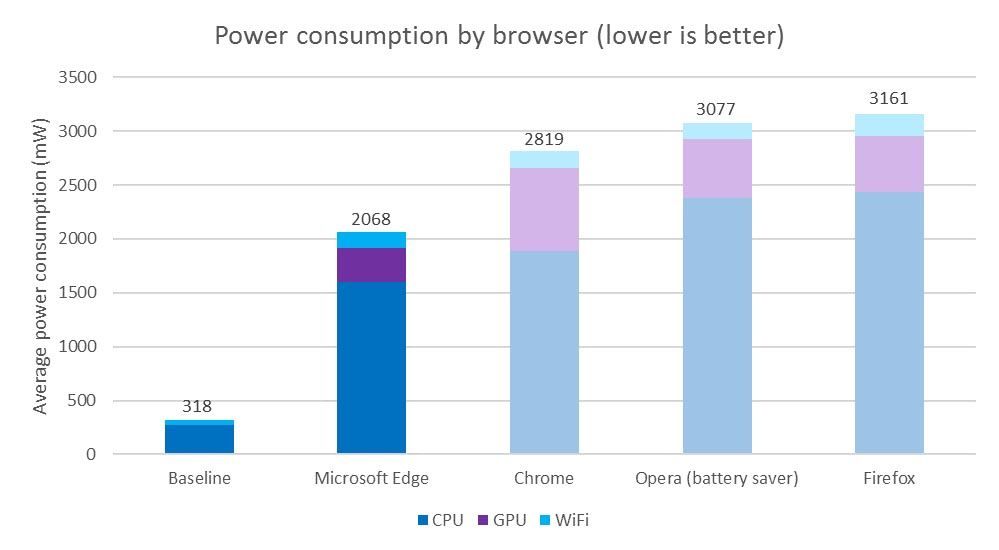 Las pruebas de Microsoft con los distintos navegadores incluyen un ciclo que visita páginas comunescomo Facebook, YouTube, Wikipedia o Amazon. Con estas pruebas en un Surface Book la batería duró 7 horas y 22 minutos usando Edge, mientras que con Chrome el tiempo se redujo a 4 horas y 19 minutos.