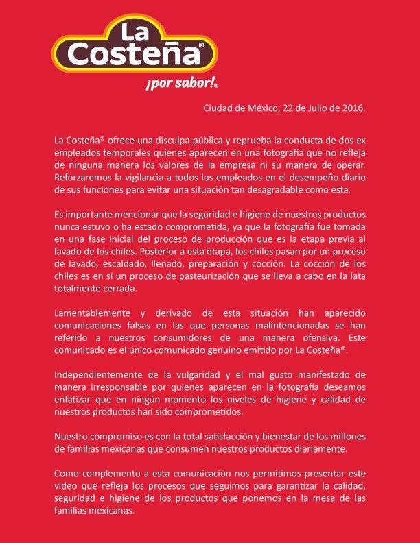 El 4 de julio pasado la empresa de alimentos La Costeña despidió a dos empleados eventuales que dos días atrás tomaron, y luego publicaron en Twitter, una foto que sugería que habían orinado sobre una línea de producción de chiles.