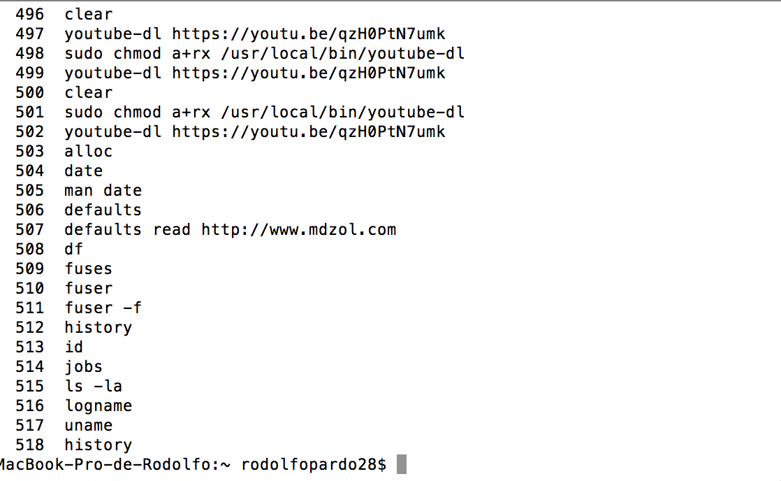 history: muestra todos los comandos ingresados por el usuario en la Terminal de Mac. Esto te da una pauta si estuvo levantando procesos alternativos a las apps convencionales.