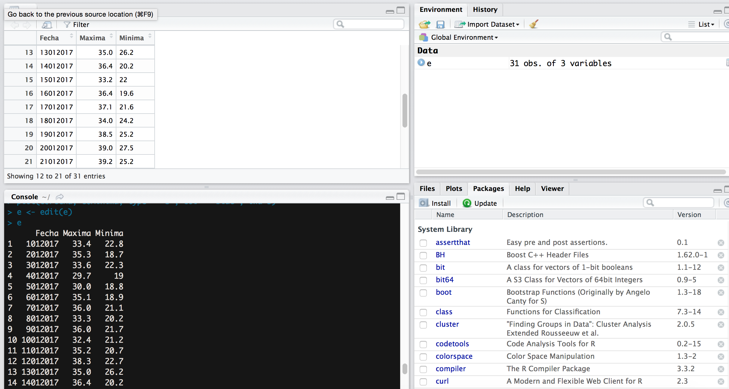 Como podés ver en la imagen de mi R, el data frame llamado "e" contiene 31 datos compuestos por tres variables:
