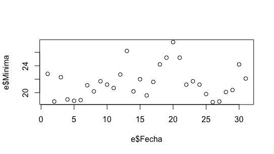 Comando: plot(e$fecha, e$Minima) En este gráfico podemos observar las mínimas registradas en cada fecha. A simple vista se puede observar como en su gran mayoría, fueron superiores a los 20ºc.