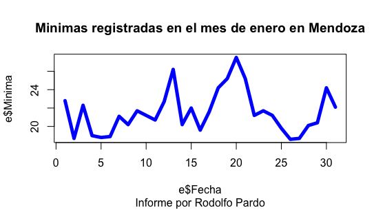 Comando: plot(e$Fecha, e$Minima, type = "l", col = "blue", lwd=5, main = "Minimas registradas en el mes de enero en Mendoza", sub = "Informe por Rodolfo Pardo")