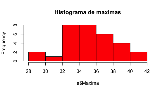 Comando: hist(e$Maxima, col = "red", main = "Histograma de maximas")