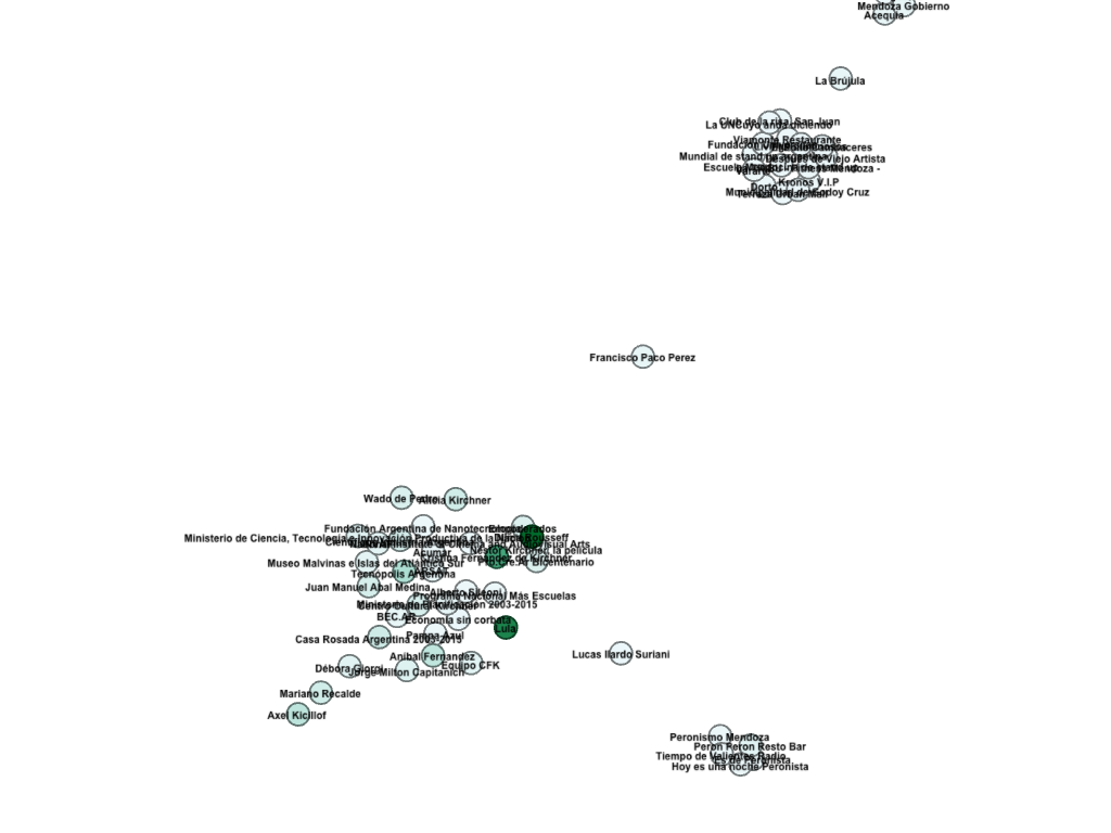 En este gráfico podemos observar como su mundo en las redes se relacionada a dos grandes nodos: el inferior ocupado por Cristina Kirchner y el superior ocupado por el Gobierno de Mendoza y sus relaciones.
