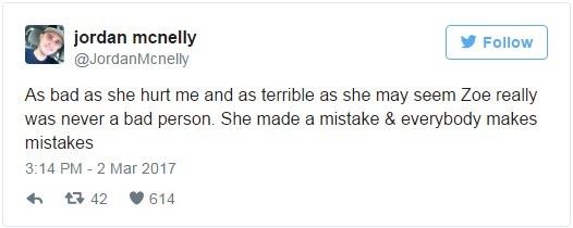 Luego, más tranquilo, McNelly contó que planeaba invitar a su novia de vacaciones al estado de la Florida (viven en Baltimore, Maryland) y que para costear el viaje trabajaba 60 horas a la semana. Igual, no guarda rencores: ayer escribió que Zoe "nunca fue una mala persona". "Por mucho que me hirió y lo terrible que todo esto parece, sólo cometió un error. Todos los cometemos", publicó Jordan en Twitter. Pobre, che...