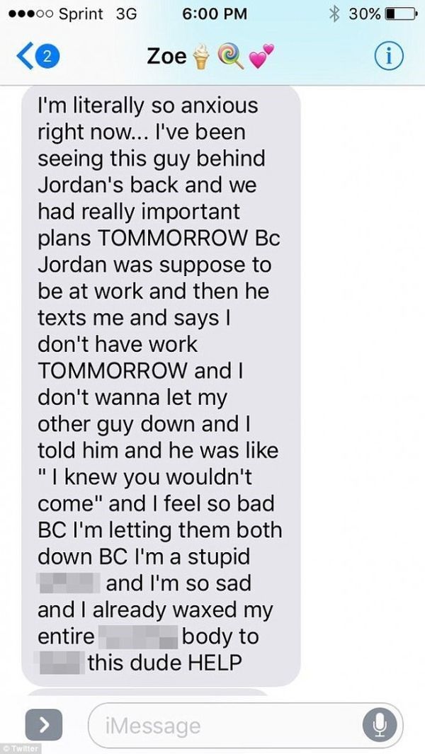"Estoy literalmente ansiosa en este momento... Estoy viendo a este chico a espaldas de Jordan (McNelly, su novio) y teníamos planes muy importantes para mañana porque Jordan supuestamente tenía que estar en el trabajo, pero después me envió un mensaje diciendo que no tenía que trabajar y yo no quiero quedarle mal a mi otro chico y le conté y me respondió: 'Sabía que no ibas a venir'. Y ahora me siento tan mal porque quedé mal con los dos y porque soy una estúpida y estoy muy triste y me había depilado todo el cuerpo para tener sexo con este chico. ¡Ayuda!", decía el mensaje que la rubia le quería mandar a su amiga, pero que por error terminó recibiendo su (ahora ex) pareja.