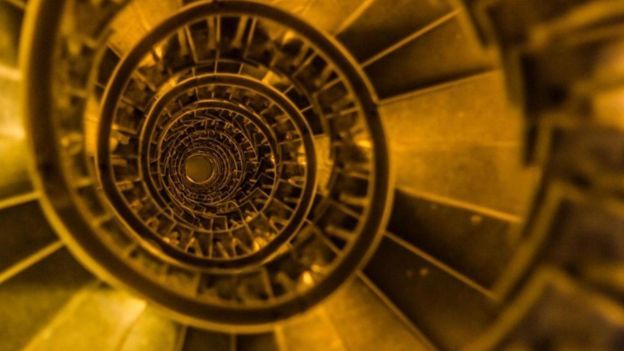 En el interior, una impresionante escalera de caracol se extiende hasta la parte superior y se retuerce como la cáscara de una naranja cortada en una cinta única y continua.