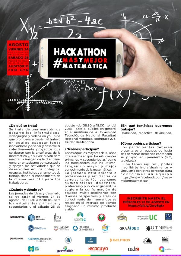MDZ se suma con fuerza a la iniciativa de la Hackathon "Más y mejor matemática" que recibe inscripciones hasta el miércoles 22, haciendo clic aquí. De tal modo, además de invitarte y pedirte que invités a más gente a sumarse, decidimos difundir desde neustras plataformas los videos que resulten ganadores, como un servicio más hacia una Mendoza grande que se construye desde muchos lugares.