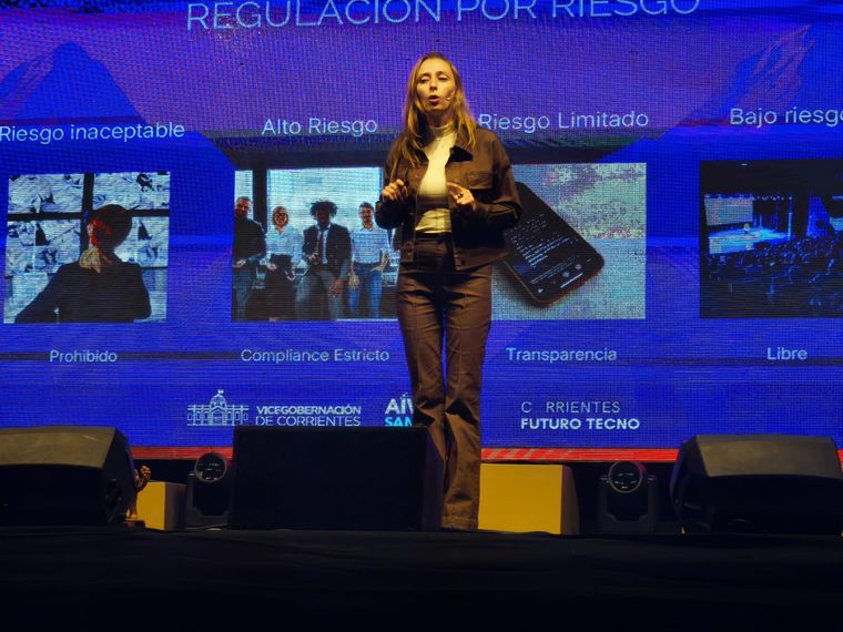 La Dra. Naylan Faisal Marottoli abrió un debate necesario sobre la Gobernanza Ética de la IA. En su presentación, explicó la clasificación del Reglamento de IA (RIA) basada en niveles de riesgo: desde el "riesgo inaceptable" (prohibido) hasta el "bajo riesgo" (libre), pasando por el "alto riesgo" que requiere un cumplimiento estricto. Faisal contrastó el modelo europeo, que regula ex ante de forma rígida para proteger derechos, con el modelo argentino, más flexible y reactivo, orientado a fomentar la innovación.