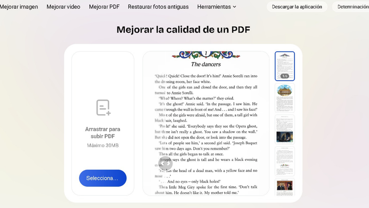Además de imágenes y videos, Artguru también incluye una herramienta de mejora de PDF con inteligencia artificial. Esta función permite optimizar documentos escaneados y PDFs borrosos.