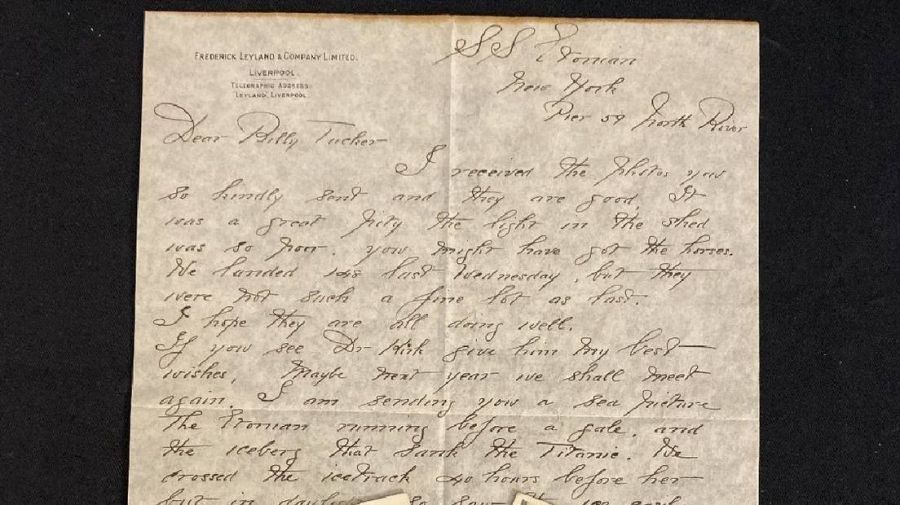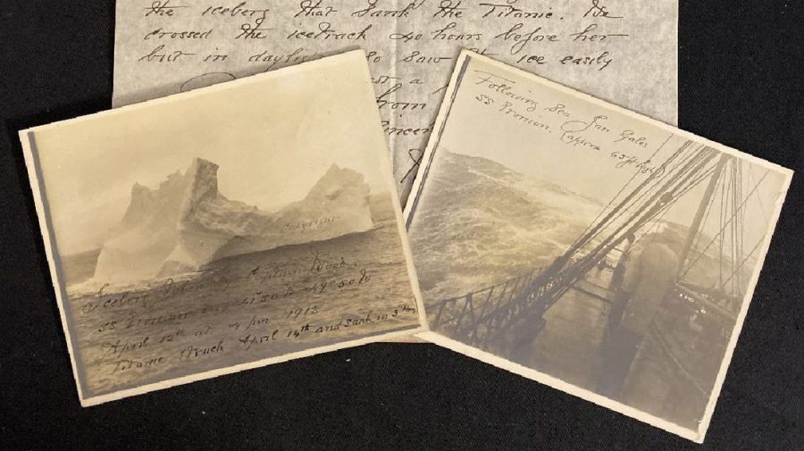 "Te envío una foto del mar, el Etonian navegando ante un vendaval y el iceberg que hundió el Titanic", escribió el marinero en una carta que el envió junto con una copia de la fotografía a su abuelo desde Nueva York. "Cruzamos las pistas de hielo 40 horas antes que él y a la luz del día, así que vi el hielo fácilmente y conseguí una foto", agregó en la misiva.