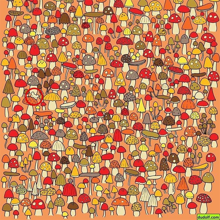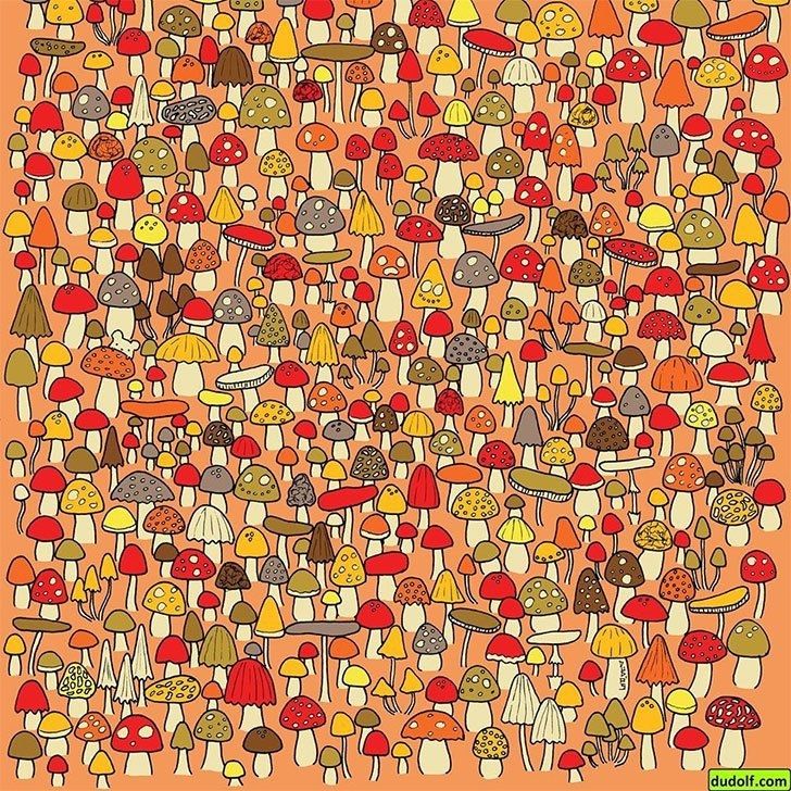 En esta colorida lámina, se puede observar cientos de setas de distintos colores y tamaños sobre un fondo color nude. En este nuevo reto visual se encuentra un animal infiltrado entre ellas, el mismo es difícil de encontrar en una primera instancia.