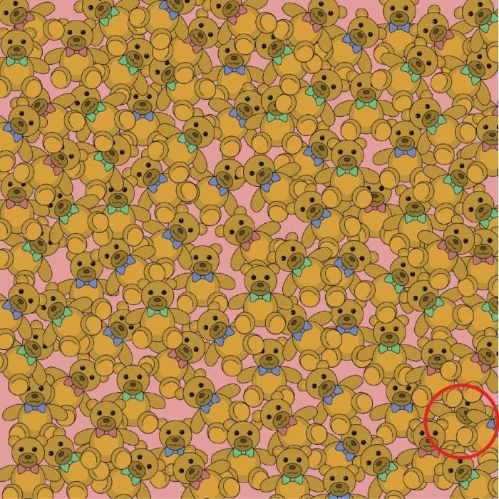 En la imagen pueden verse decenas de ositos con moños de distintos colores. Escondido en la multitud de muñecos, hay uno que no tiene la prenda, a ese hay que encontrar.