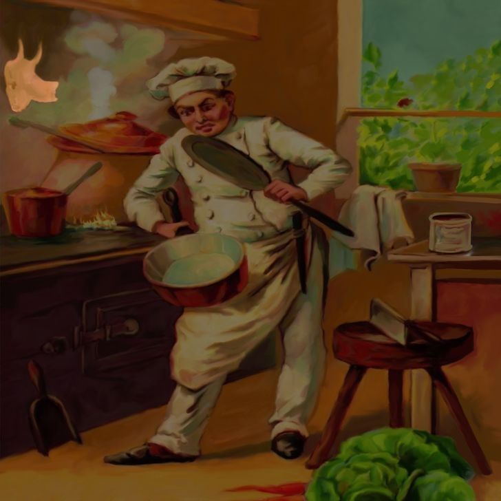 En esta lámina se puede observar a un chef que tiene casi todos los elementos preparados para realizar una receta, el problema es que no encuentra la carne que va a cocinar. Una pequeña pista es que la carne aparece camuflado en forma de animal en este reto visual.