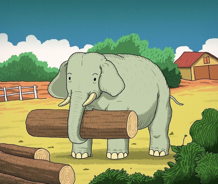 En esta lámina podemos observar un elefante sosteniendo un tronco de madera con su trompa. En este reto visual se encuentra un mamífero oculto.