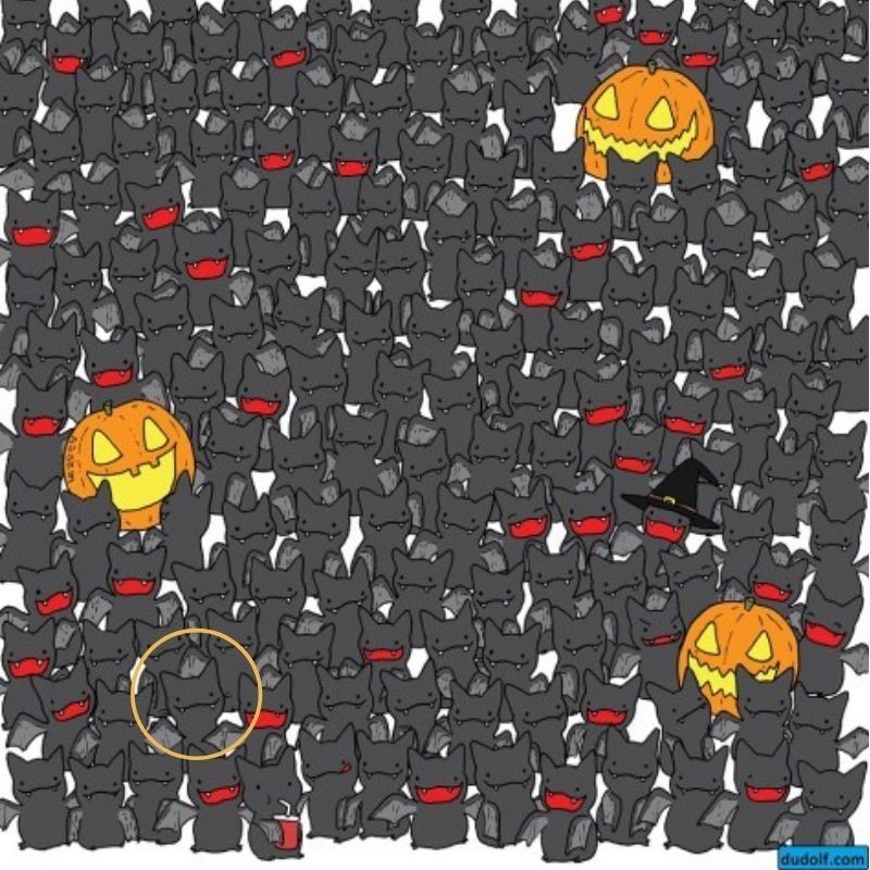 En esta lámina estilo Halloween podemos observar decenas de murciélagos en un fondo blanco uno al lado del otro. En este reto visual se encuentra un intruso oculto.