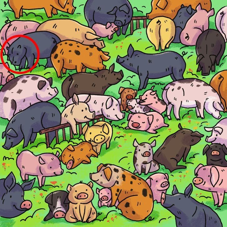 En esta lámina podemos observar decenas de cerdos disfrutando de su ambiente natural. En este reto visual se encuentra un mamífero distinto escondido.