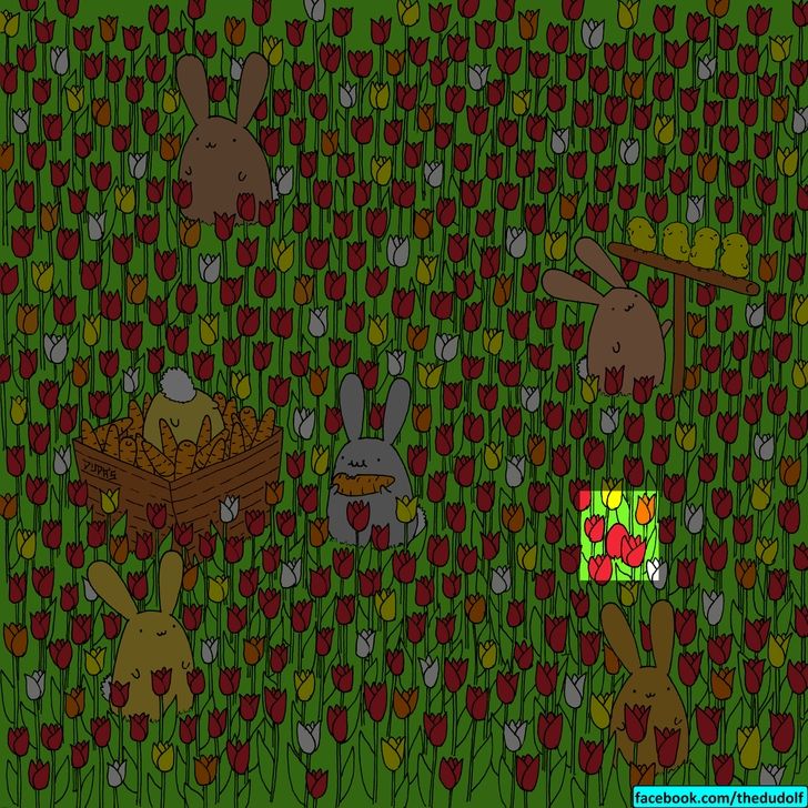 En esta colorida lámina podemos observar varios conejos entre flores en el campo. En este reto visual se encuentra un objeto infiltrado en la misma