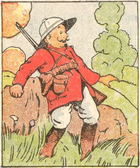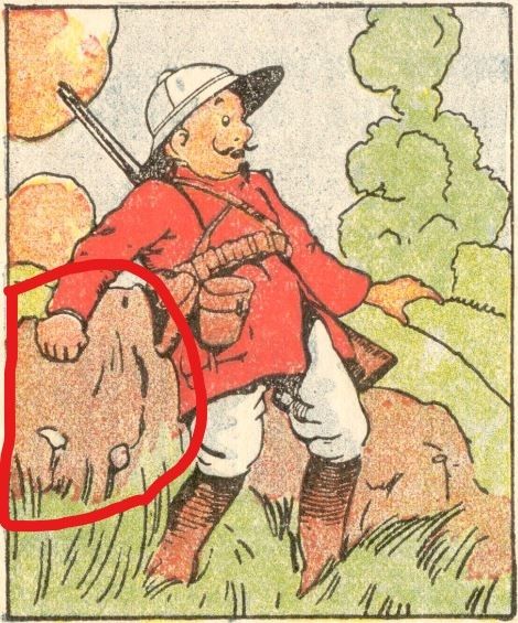 En esta antigua lámina podemos observar un cazador en la selva con cara de sorpresa en su rostro. En este reto visual se encuentra una amenaza camuflada para este hombre.