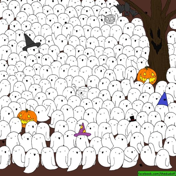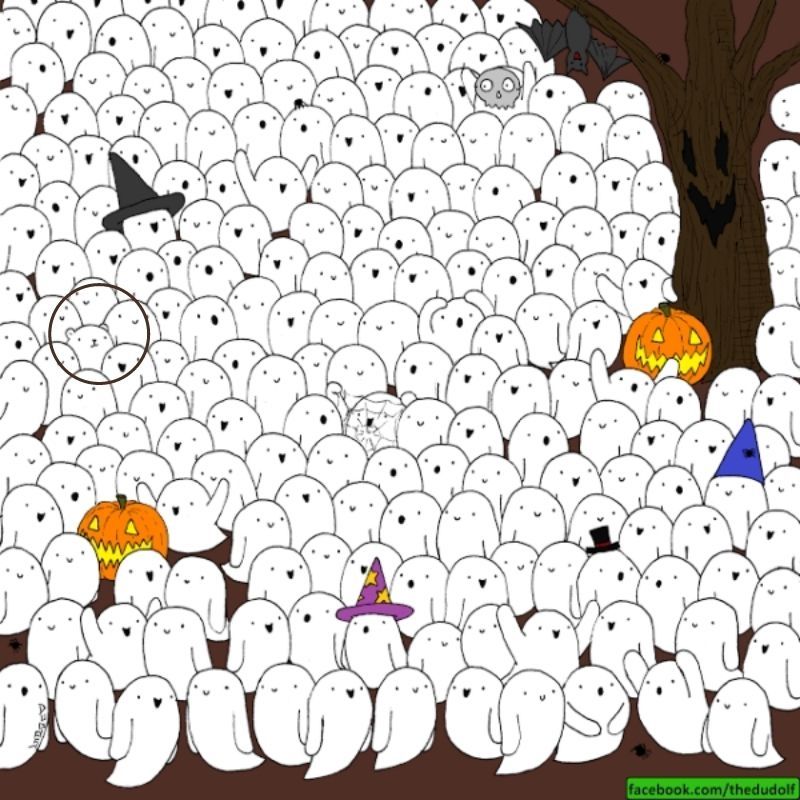 En esta lámina estilo Halloween podemos observar cientos de fantasmas uno al lado del otro. En este reto visual se encuentra camuflado un úrsido entre ellos.