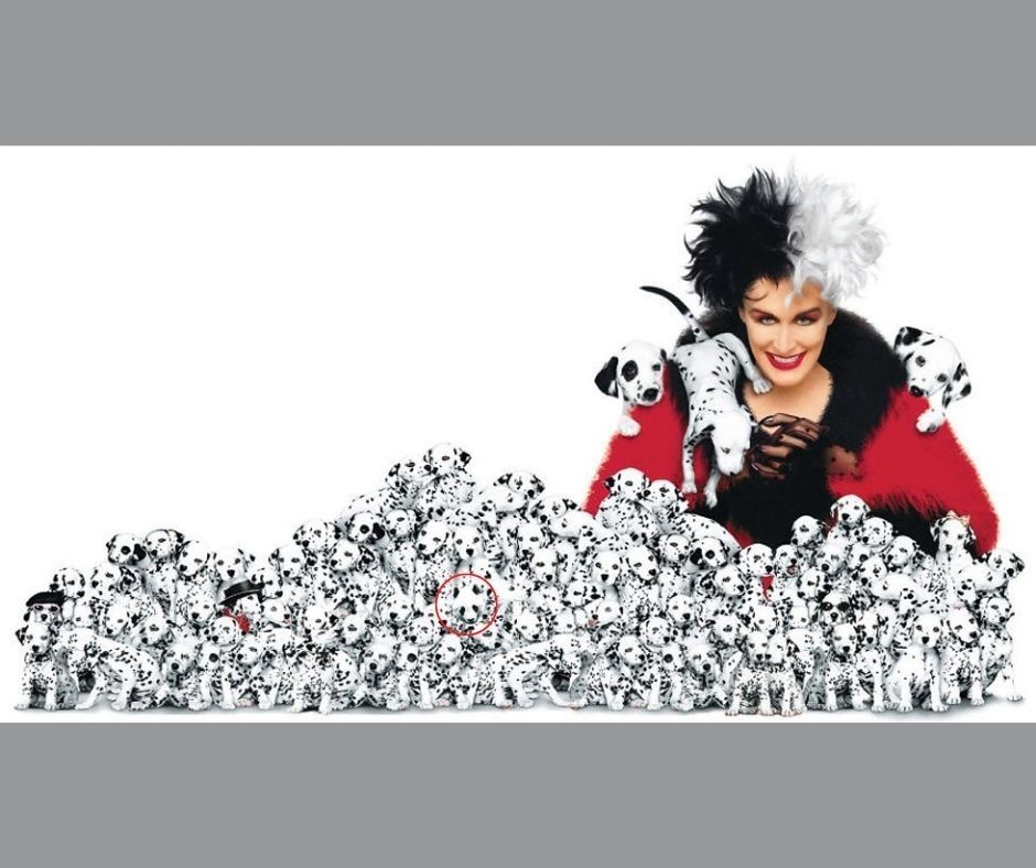 En esta lámina podemos observar una imagen de la reconocida película de Disney “101 dálmatas”. En este reto visual se encuentran un úrsido oculto en la lámina.