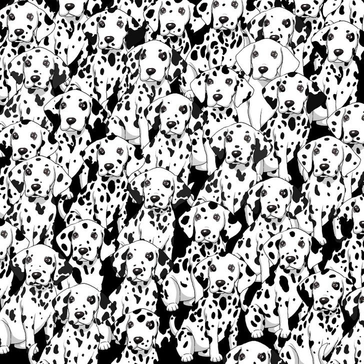 En esta lámina donde predomina el blanco y negro podemos observar decenas de dálmatas uno al lado de otro. En este reto visual se encuentra un can infiltrado.