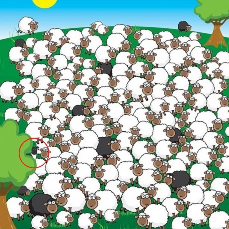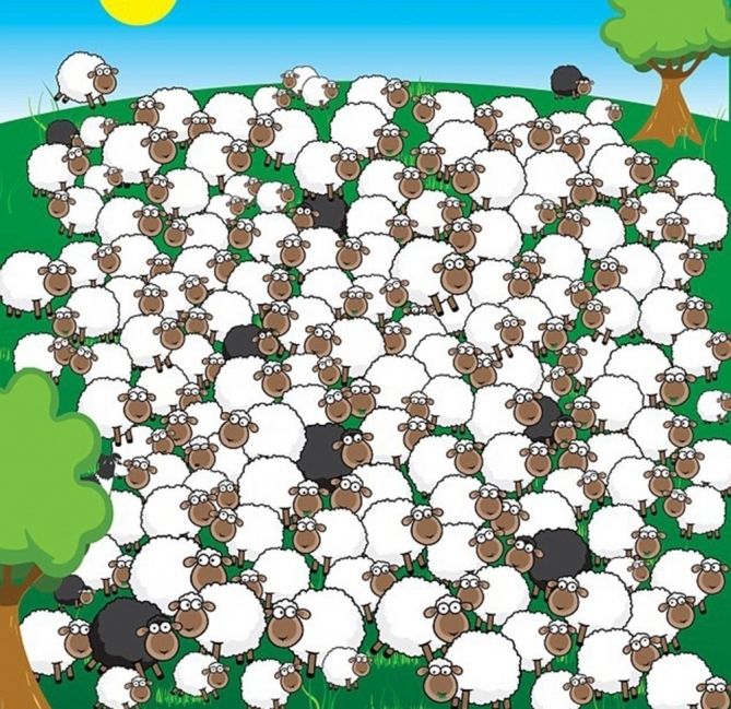 En esta lámina podemos observar una decenas de ovejas en una pradera entre ellas se encuentran algunas de color blanco y otras de color negro. En este reto visual se encuentran un canino oculto en la lámina.