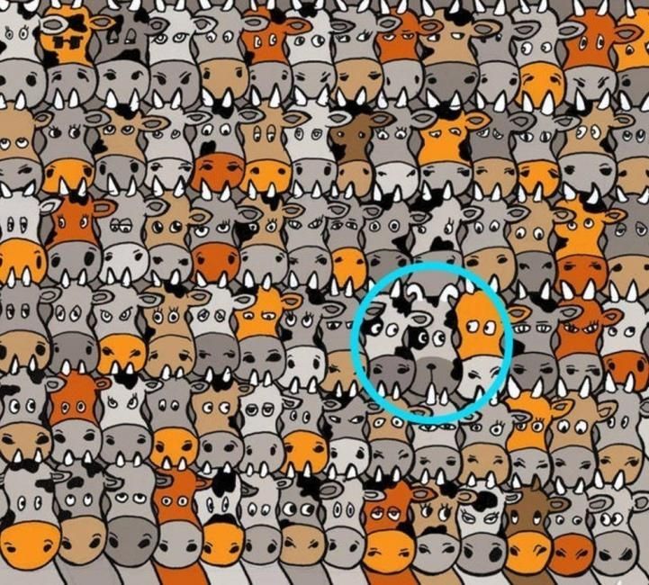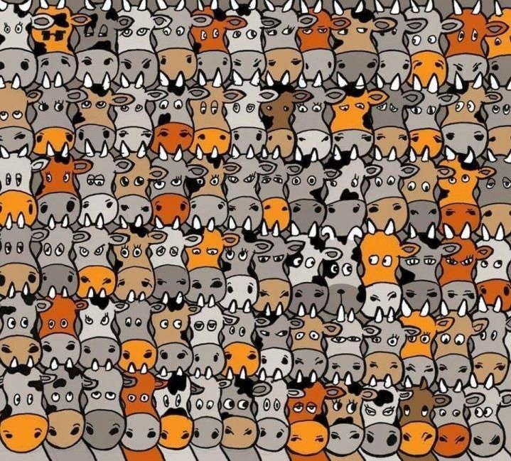 En esta lámina podemos observar decenas de vacas una al lado de la otra en un fondo gris. En este reto visual se encuentra un canino oculto en la lámina.