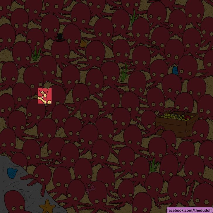 En esta imagen se puede ver a muchos pulpos juntos en su hábitat natural. En este desafío visual se encuentra escondido un pequeño intruso.